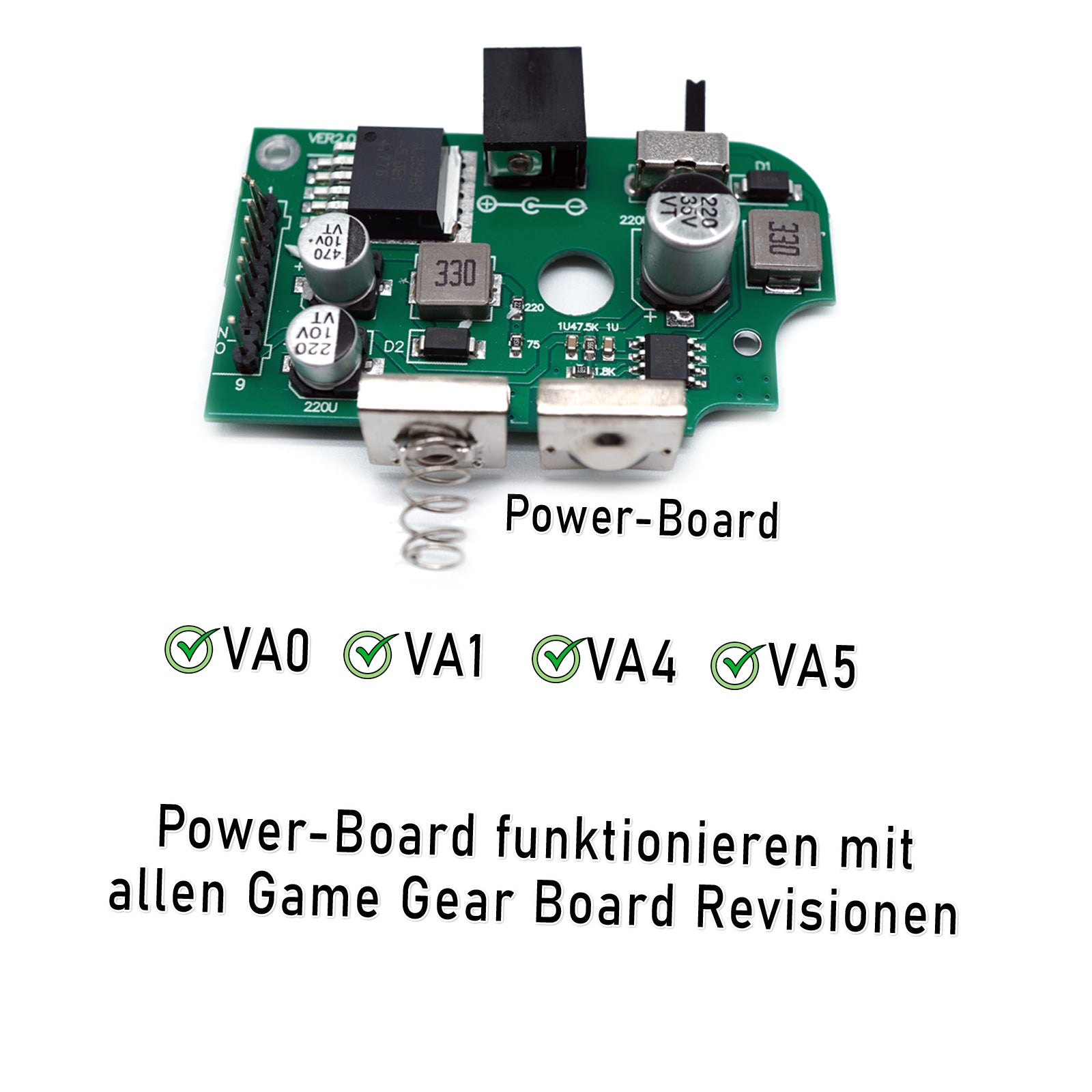 Die häufig angebotenen Kondensatoren Sets sind in der Regel mit den Game Gear VA4 und VA5 Revisionen nicht kompatibel. Das Power Board kannst du aber auch bei diesen Konsolen verwenden.